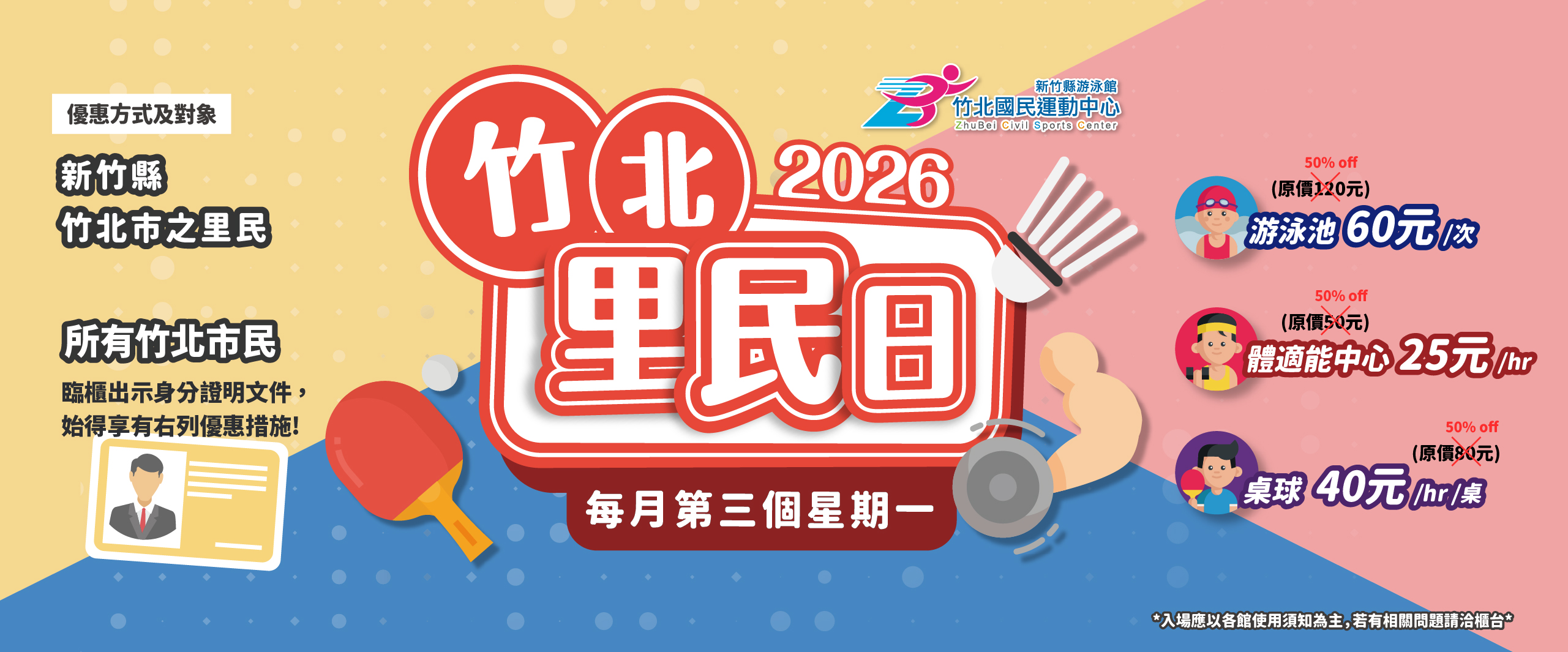 住在竹北的你,千萬別錯過這一天! 每月第三個星期一 里民專屬優惠日,帶著身分證就能輕鬆動起來 里民限定優惠 桌 […]
