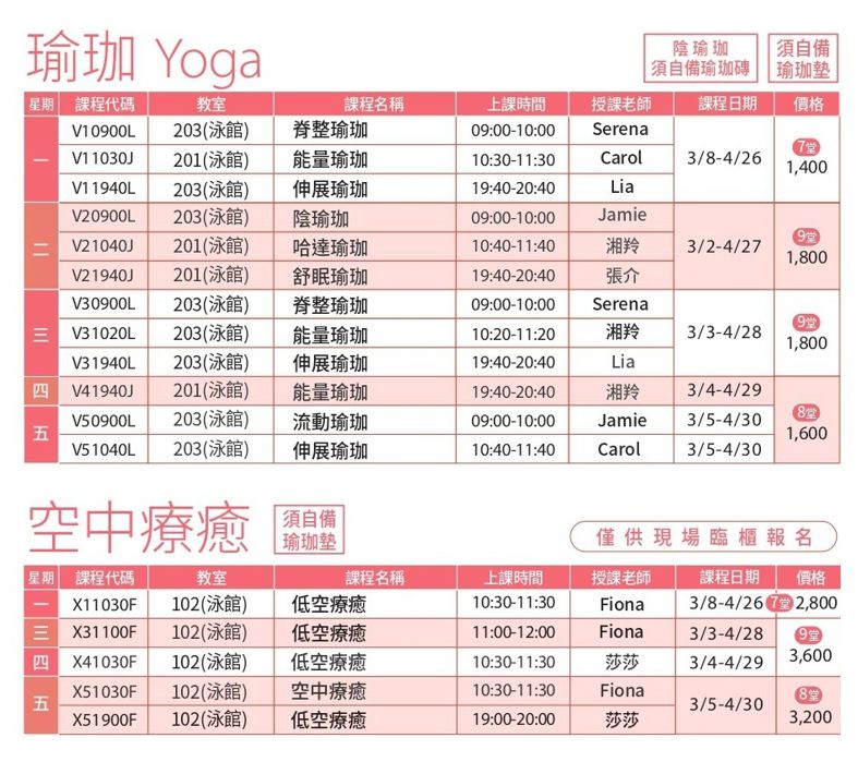 有氧課程異動公告