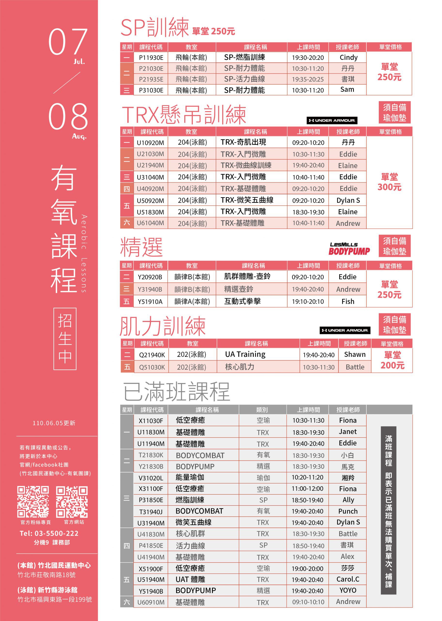 有氧課程異動公告