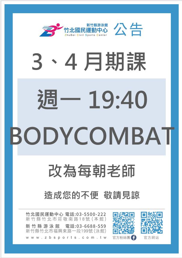 3、4月週一1940-BODYCOMBAT改為每朝