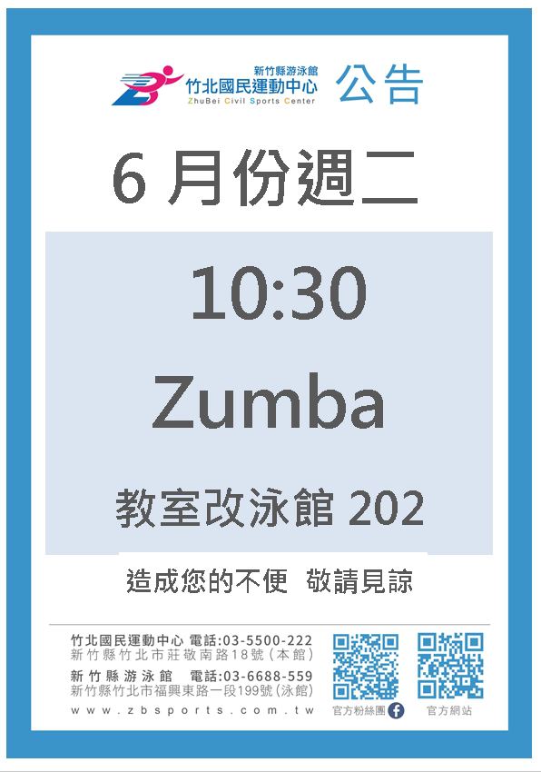 六月份週二1030 Zumba教室改泳館202