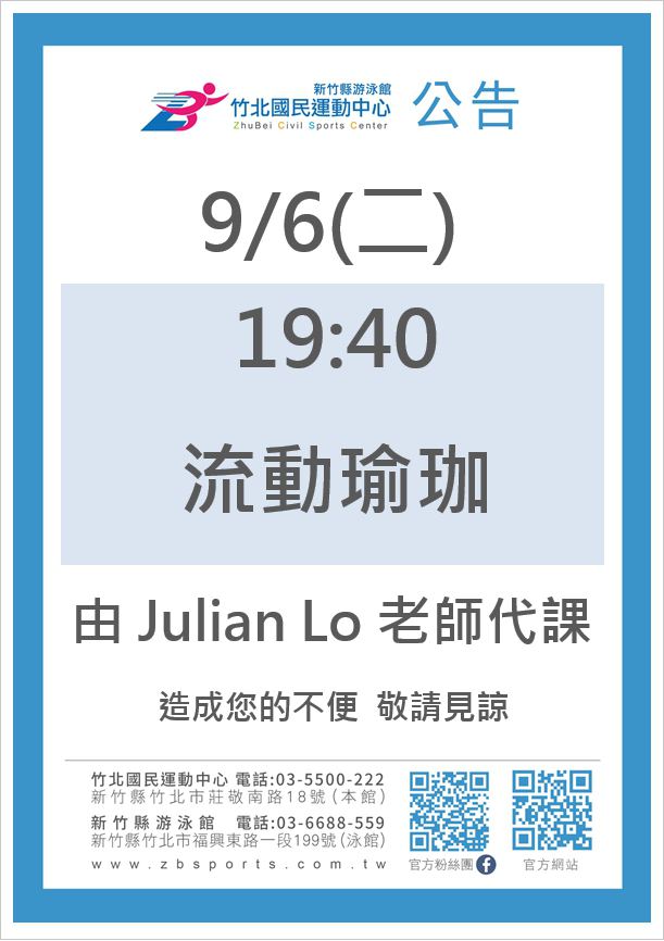 0906週二流動瑜珈請假換Julian Lo老師
