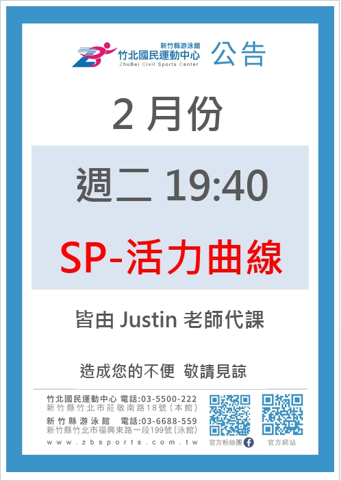 2月每週二晚上sp活力曲線由justin老師代課