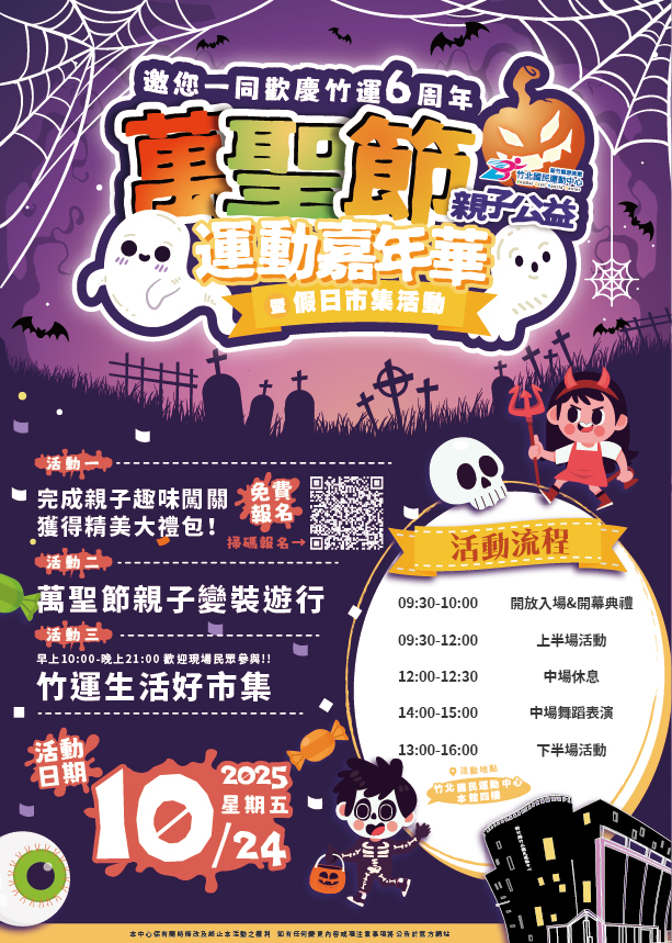 今年週年慶結合萬聖節主題,讓親子除了來竹運體驗各種運動器材之外,也能感受節日的歡樂氛圍,讓親子關係更緊密結合之外,也能讓民眾感受到竹運跟在地密不可分的情感。
