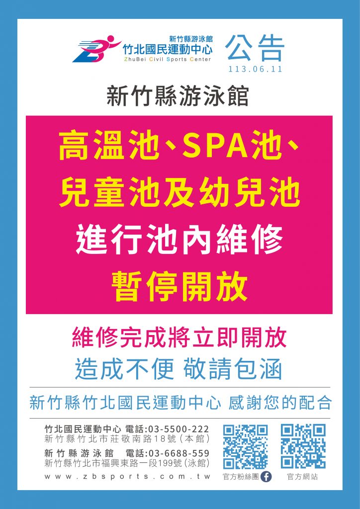 高溫池、SPA池、兒童池及幼兒池 暫停開放