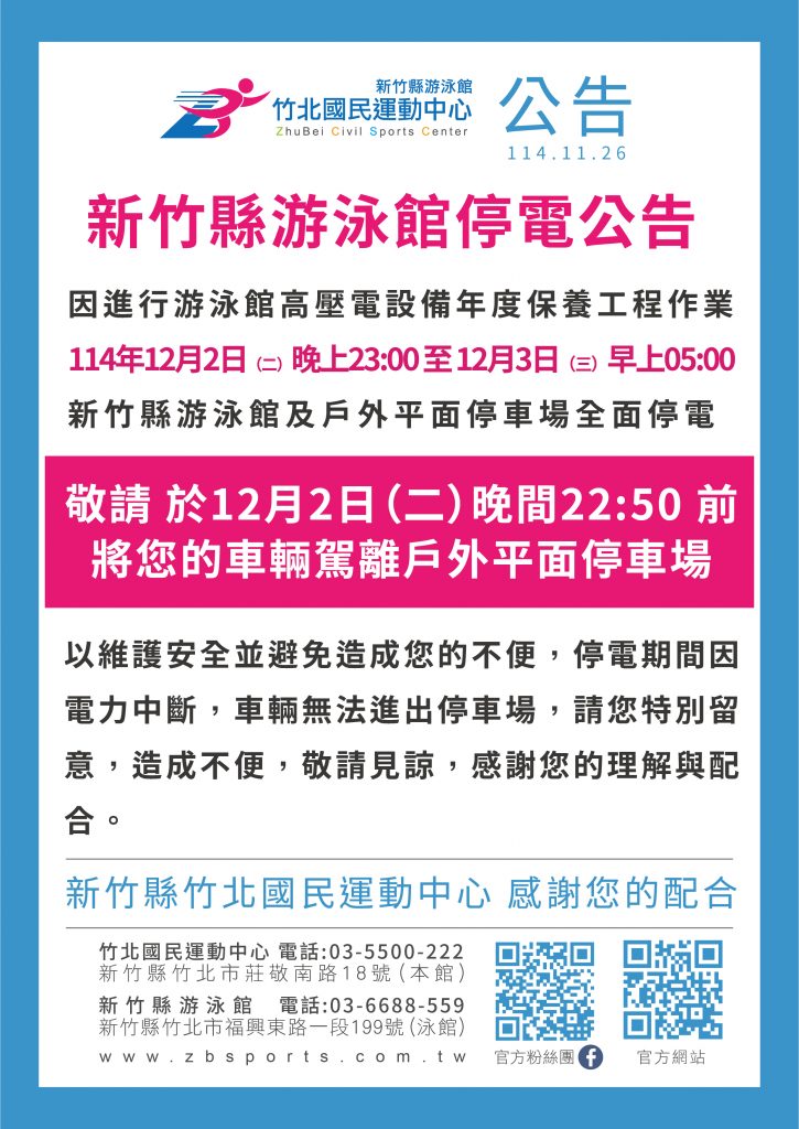 新竹縣游泳館 及戶外平面停車場將全面停電。
