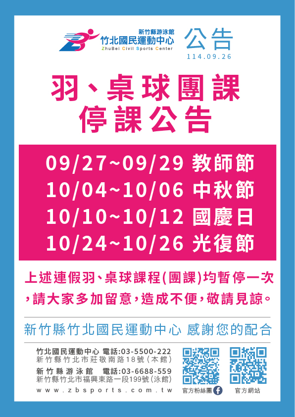 【公告|羽、桌球團課停課公告】 Posted on 2025-09-262025-09-26 by zbsports_write 📢 羽、桌球團課停課公告 停課日期: 09/27 ~ 09/29 👉 教師節 10/04 ~ 10/06 👉 中秋節 10/10 ~ 10/12 👉 國慶日 10/24 ~ 10/26 👉 光復節 以上連假期間,羽球、桌球團課均暫停一次,請大家多加留意。造成不便,敬請見諒 🙏 新竹縣竹北國民運動中心 感謝您的配合 Posted in 未分類.