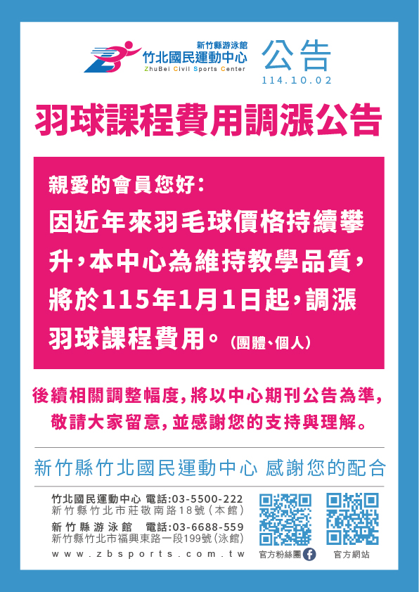 【羽球課程費用調整公告】 Posted on 2025-10-092025-10-09 by zbsports_write 【羽球課程費用調整公告】親愛的會員您好:因羽球價格持續上漲,為維持課程教學品質,本中心將自 115年1月1日起 調整羽球課程費用(團體、個人)。 後續調整幅度將以公告為準,感謝大家的支持與理解,並敬請留意中心最新消息 Posted in 未分類.
