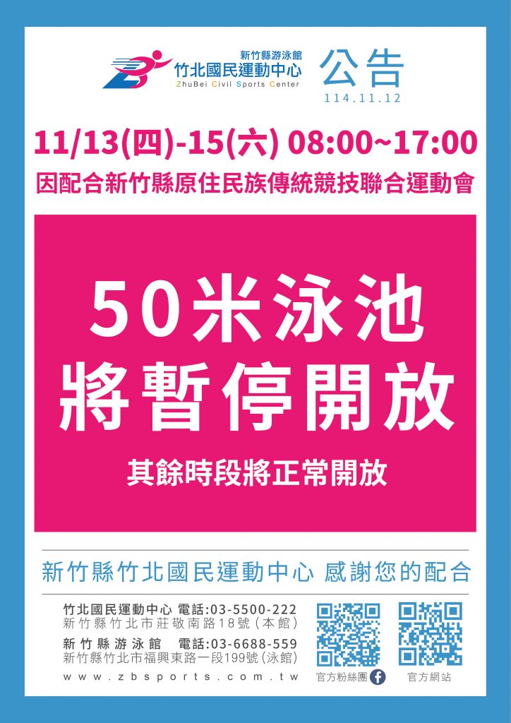 【50米泳池暫停開放公告】 Posted on 2025-11-122025-11-12 by zbsports_write 【50米泳池暫停開放公告】因配合「新竹縣原住民族傳統競技聯合運動會」活動,🏊♀️ 11/13(四)~11/15(六)08:00–17:0050米泳池將 暫停開放,其餘時段正常營運。 感謝您的理解與配合 Posted in 最新消息.