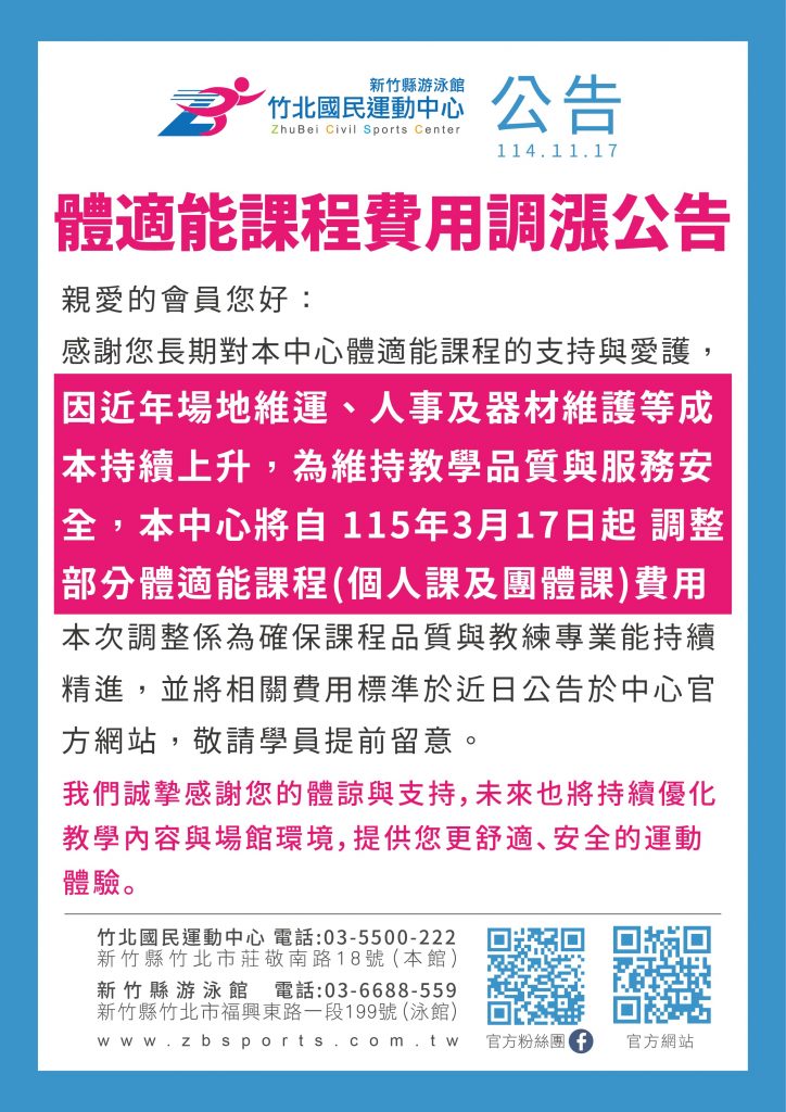【體適能課程費用調漲日期調整公告】 Posted on 2025-11-172025-11-17 by zbsports_write 原定 1 月 1 日要調整的羽球課程費用,因調整規劃延後,將從 3 月 17 日起 才開始調漲。 感謝大家的體諒與支持! Posted in 最新消息.