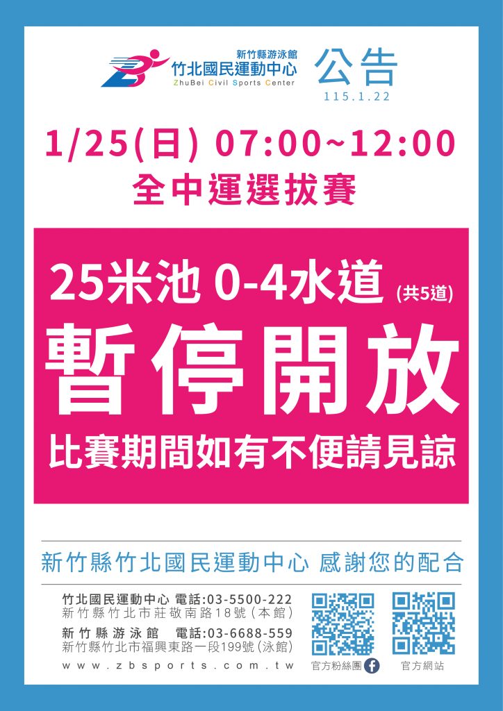 【25公尺泳池暫停開放】 Posted on 2026-01-222026-01-22 by zbsports_write 📅 1/25(日)07:00–12:00因辦理 全中運選拔賽,🏊 25公尺泳池 0–4 水道(共5道)將暫停開放 造成不便,敬請見諒,感謝您的理解與配合。 新竹縣竹北國民運動中心 敬啟 Posted in 未分類.