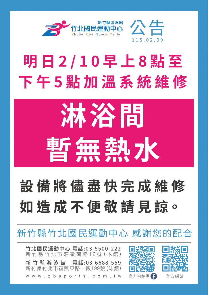 【加溫系統維修公告】 Posted on 2026-02-092026-02-09 by zbsports_write 本中心將於115 年 2 月 10 日(星期一)上午 8 點至下午 5 點進行加溫系統維修作業。 維修期間,淋浴間將暫無提供熱水,相關設備將儘速完成檢修作業。 造成不便,敬請見諒,感謝您的體諒與配合。 新竹縣竹北國民運動中心 敬啟 Posted in 未分類.