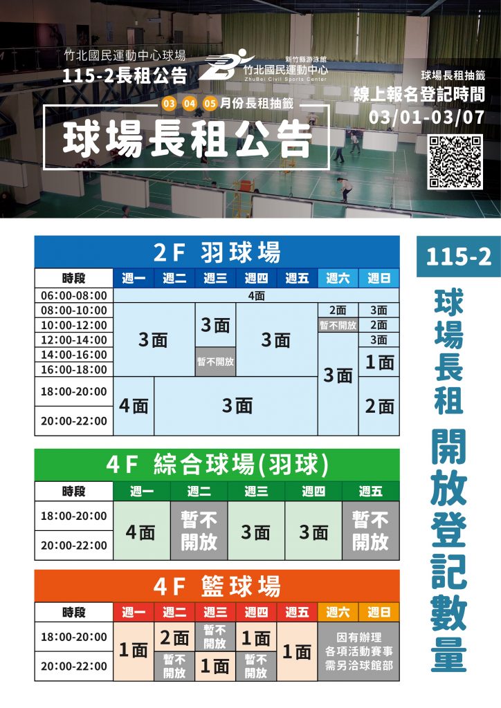 【115-2季//球場長租抽籤辦法、球場長租開放登記數量】 Posted on 2026-02-252026-02-25 by zbsports_write 【115-2季//球場長租抽籤辦法、球場長租開放登記數量】 115年度第2季(04-06月)長租即將開跑‼‼🏸⛹♂🏸⛹♂ 📍登記時間|115年3月1-7日 📍抽籤時間|115年3月16日 09:30 📍登記網址|線上登記 https://fe.xuanen.com.tw/fe02.aspx (無需繳交保證金)<線上登記使用教學 https://reurl.cc/kqlrjq > 專線:03-5500222#24 球館部 Posted in 最新消息, 球場專區.