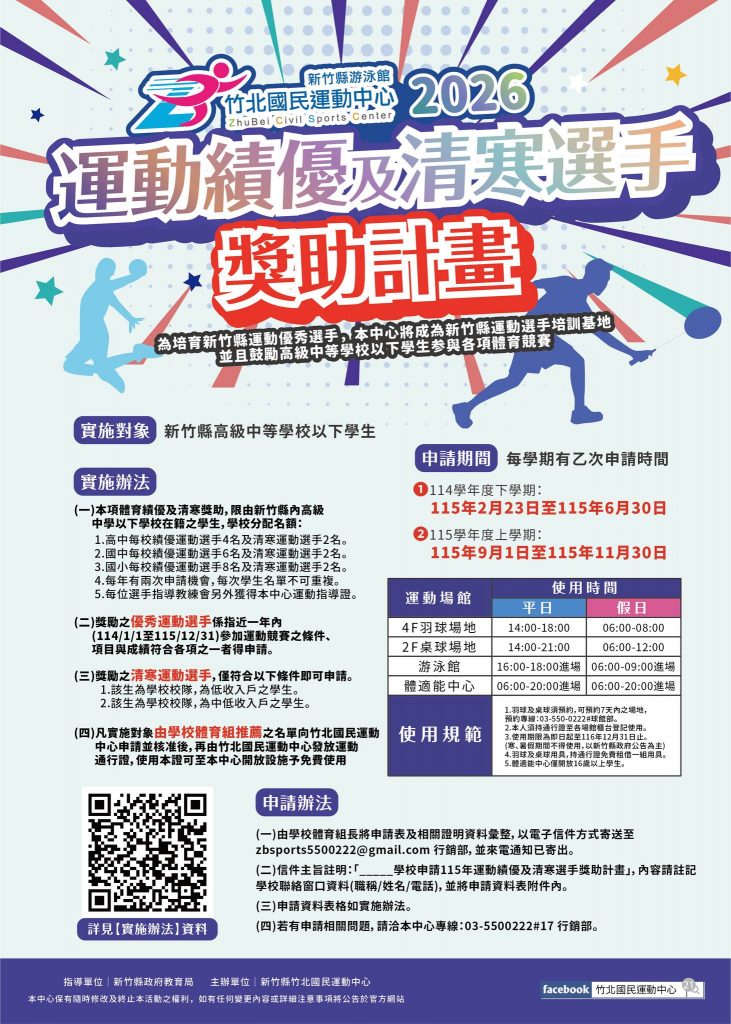 為培育優秀運動人才、鼓勵學生勇敢逐夢,竹北國民運動中心推出「運動績優及清寒選手獎助計畫」,邀請熱愛運動的你一起站上更高舞台💪