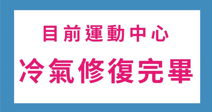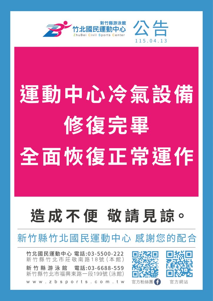 【公告|冷氣設備修復完成】 Posted on 2026-04-132026-04-13 by zbsports_write 運動中心冷氣設備已全數修復完畢,目前場館已恢復正常運作,請大家安心入場使用! 感謝大家在維修期間的體諒與配合,造成不便,敬請見諒 Posted in 最新消息.